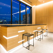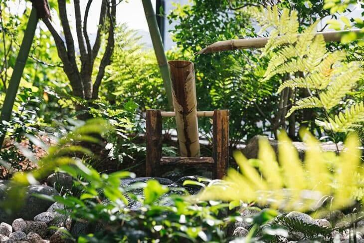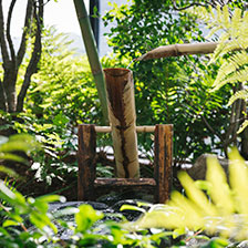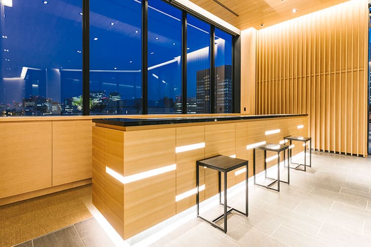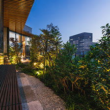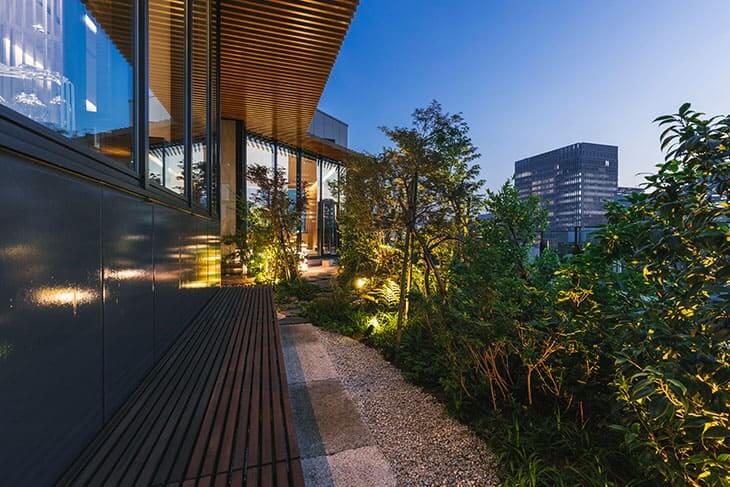都心の景色を背景に、ししおどしや水盤をしつらえた屋上の日本庭園が非日常感のある緑の世界へ誘います。